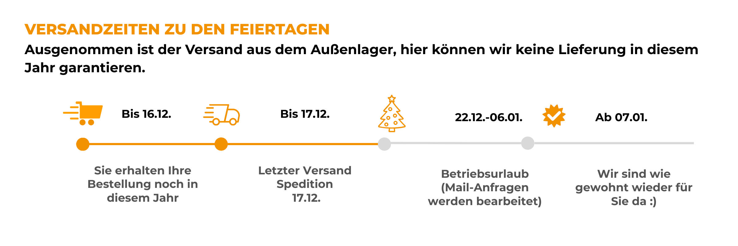 Ausgenommen ist der Versand aus dem Außenlager, hier können wir keine Lieferung in diesem Jahr garantieren.